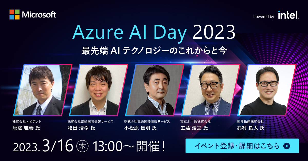 日本マイクロソフト株式会社が2023年3月16日に開催する「Azure AI Day 2023 ~最先端AIテクノロジーのこれからと今~」のCustomer Story Trackに、Xイノベーション本部 AIトランスフォーメーションセンターの小松原信明と牧田浩樹が登壇します。