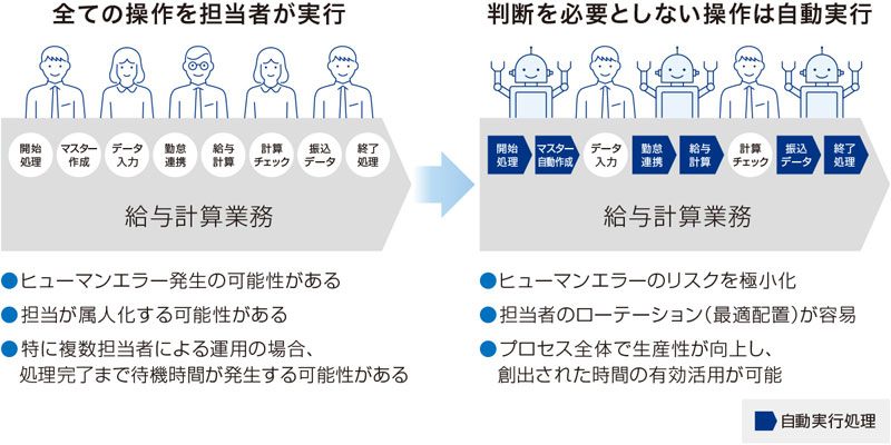 BPA機能により、給与計算業務において担当者の判断が不要な操作が自動化され、作業効率向上やヒューマンエラーの削減に貢献します。また、実行時刻指定が可能で、処理実行を夜間にすれば、翌日すぐに後続処理を進められるため、作業プロセスの効率化ができます。