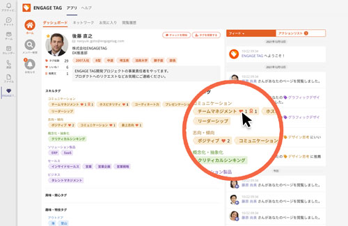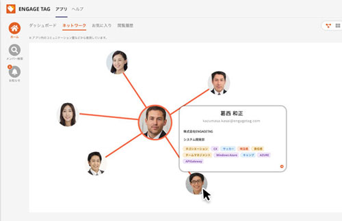 ENGAGE TAG®は、ユーザーのMicrosoft Teams上におけるコミュニケーションなどの活動データを自動で集積し、従業員同士の人材ネットワークを可視化します。従業員検索を実行する際も、検索対象の社員が持つコミュニティを直感的に把握することができます。