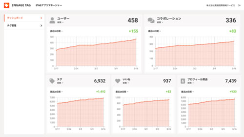 組織の管理者向けにENGAGE TAG®上でのコミュニケーションデータは個別に数値化・グラフ化され、専用のWEB画面で従業員のスキルや活動状況、組織の状態を数値で把握することができます。